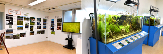 そして、「海に生きる水草」展示会場。最初に迎えるのは、沖縄の海草群落です。(手前味噌ながら)本当に現地の様子に近いです。水槽内を掃除して動き回るクモガイにも注目。