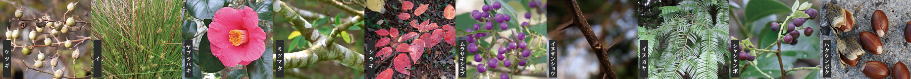 「植物とあかり」展示の様子石油、ガスや電気が登場する以前は、動植物からとった油や蝋(ろう)に火を灯し、あかりとしました。油の原料はイヌガヤやツバキなどの木の実や、荏胡麻(えごま)や菜種などの草の実です。蝋は漆や櫨(はぜ)などの実を原料にした木蝋です。これら燃料となる油や蝋や火をつけるために必要な火口、つけ木、さらに燈火器そのものにも、多くの種類の植物が利用されました。かつて「あかり」に使われていた植物は百種類を超えます。園内には五十種類以上も植栽されています。いくつ見つけられますか?