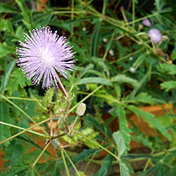 「オジギソウは,5月頃に種をまくと50cmぐらいまで大きくなります。そして,ボンボンのように丸くて,淡い紫色のかわいらしい花を咲かせます。しかし,大きくなってくると,茎のところにトゲができます。」