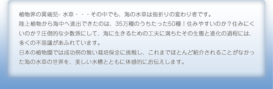 海の中にも水草がいます!海草(うみくさ)です。 ワカメやコンブなどの海藻ではありません。花を咲かせる植物が海の中にもいるのです。その群落はあたかも海中の草原のように美しく、生命感にあふれた世界です。いつ頃、どのように海中へ進出したのか?なぜ、海の中で生きられるのか?そして、海中や海面で咲く花のしくみ、海をどのように移動しているのかなど、海草の不思議を初歩から最先端まで楽しく紹介します。