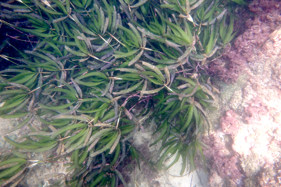 上の写真は、実際に現地で撮影したものです。水深は2~3m程度といったところでしょうか。姿形はどことなくリュウキュウアマモに似ているような気がします…。
