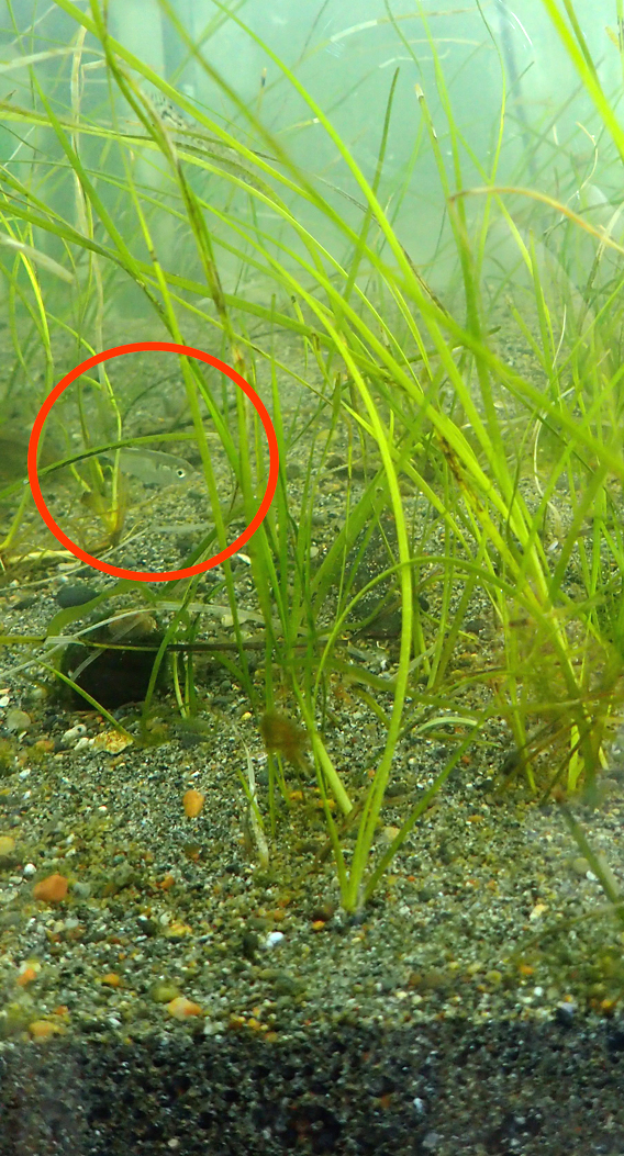 大体この水槽に40匹ほどボラの稚魚を入れたのですが…すごい食欲でした。ちなみに赤い丸のなかにいるのがボラの稚魚です。