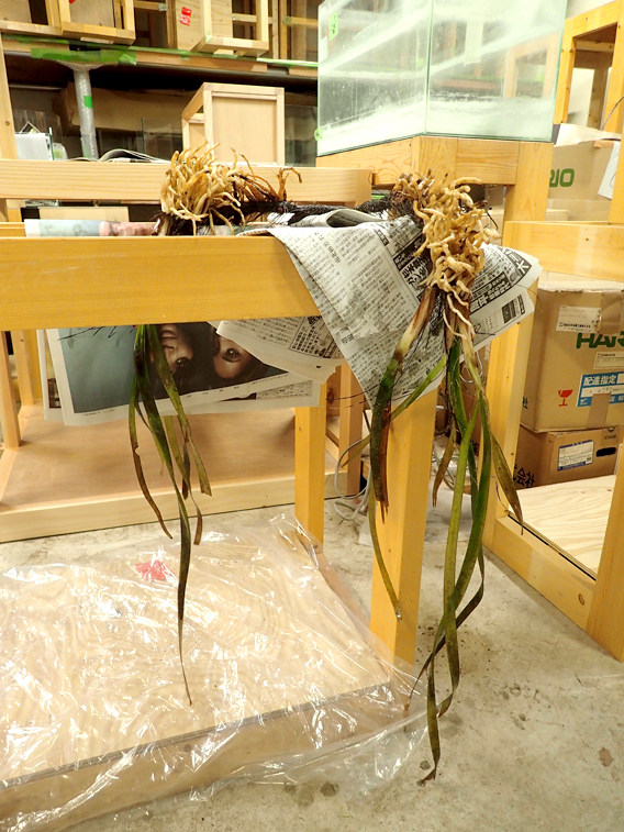 あれ?なんでひっくり返っているんだ?という疑問について補足をしますと、標本にしようとしたウミショウブの大きな根茎を展示するためには、通常の方法では上手く行かなさそう…。