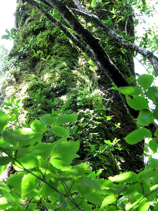 これまで、木の上でくらす植物の進化を研究してきました。ブナ林でみられる着生植物の多くは、コケ植物に埋もれるようにして生育しています。これまで調べてきたクモキリソウ属などラン科植物は、発芽に必要な栄養を菌根菌から得るため、菌根菌がいないと生育できません。そのため、植物(維管束植物)、コケ、菌類に何らかの相互関係があるのではないかと考えています。