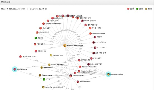 たとえば、きのこAは植物Bから栄養をもらう一方、植物Cには寄生し、そのきのこAは昆虫DやEによって、食べられる。昆虫Dは植物Fも食べ・・・ みたいな感じでいろいろな生物の関係を線でつないだら、面白いと思いませんか?意外な生物どうしが近い関係にあるかもしません。そこで、今回の総合研究ではこの研究データを集め、生物相互関係を集めて、図解するデータベースを作りました。まだ試作品ですが、操作できるようにしておきたく思いますので、試してみてください。