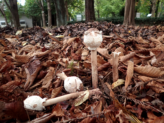 今年のきのこ展最後のブログは、おそらく当園で今年最後の1本になるであろうマントカラカサタケの写真でお別れしたいと思います。秋も深まってきた筑波実験植物園で、マントカラカサタケが健気に成長を続けている様子は、おそらくあと数日は見ることができると思います。