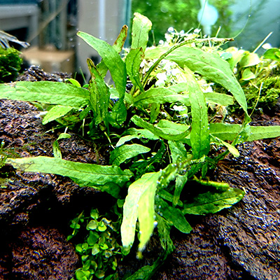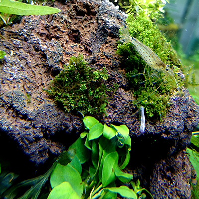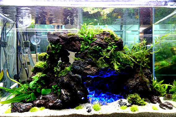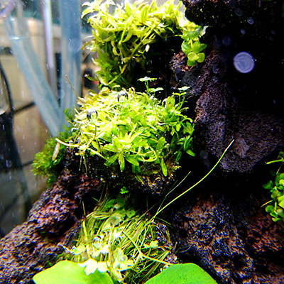 使用したのは、岩などに活着する水草としてお馴染みの、ミクロソリウム、アヌビアス、コケ類ももちろん使いましたが、パールグラス、アンブレラプラント、オーストラリアンクローバー等の、普段なら土に植えて使用する水草も石に巻いて使用しました。