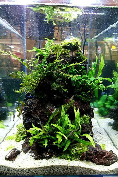 今回は、土に根を張らずとも、岩などに活着して生育できる性質を持つ水草を中心にレイアウトしました。また、展示会場にて前後左右、4方向より見て楽しんで頂けるよう組み上げてあります。