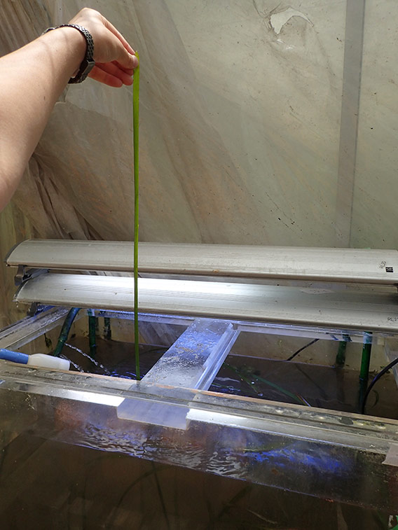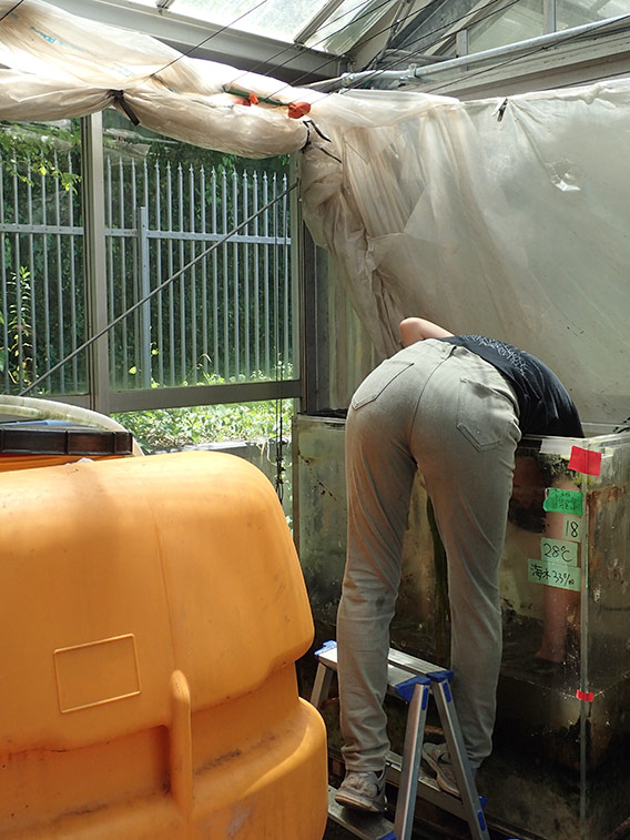 ウミショウブは葉が長いためある程度水深がないといけません。そのため深さ90cmの水槽を使用しているのですが、とにかく深いためメンテナンスやこのように作業する時は大変なのです……。