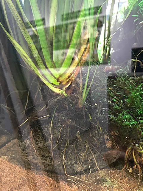 レイアウトに選んだ小石に太い根をはるセキショウ。これだけ太い根があるなら水質を安定させるだけの栄養吸収力があると予測したのも選んだ理由の1つ。他の草は根がはるのが難しくても、セキショウなら10日間の水質安定に貢献してくれるかなと計算してレイアウトを構成しているそうです。先読み万全!!です。