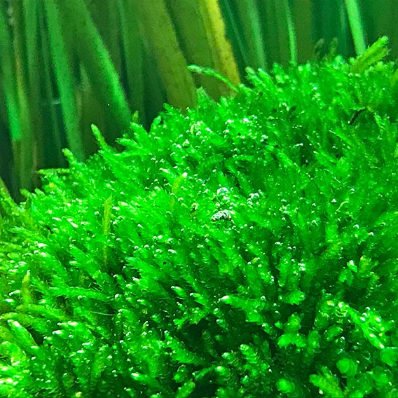 「実際より明るく演出する為に採取した石から明るい色の物をセレクトしたり、実際には無い流木を入れて苔を載せたことで水景に締まりをつけています。砂地の川底で速い流れの中にたくましく生える水草は小石に根を絡めて育っているんだよ!」
