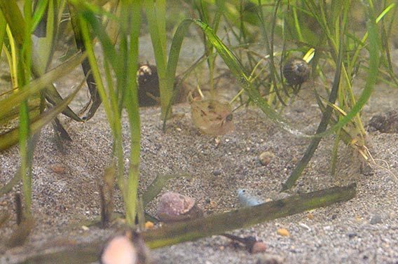 アマモ水槽の中のアミメハギ。アマモ場に欠かせないかわいい魚です。ぜひ見つけてみてください。