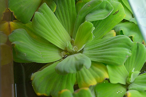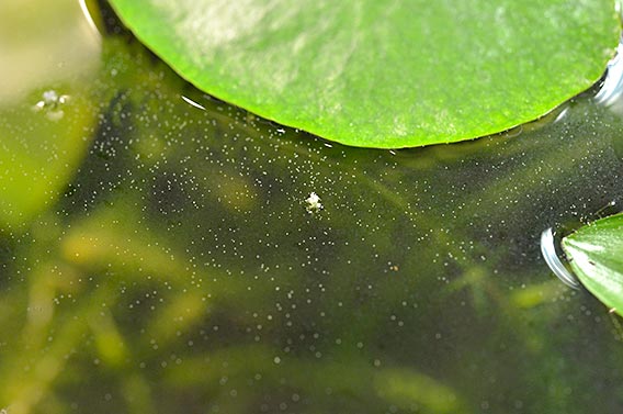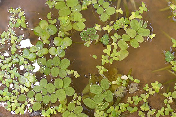 そこに浮いているのは、さまざまな浮き草類(浮遊性水草)。6種あるのがわかりますか?それぞれの名前は会場で確かめてみてください。