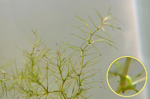 幻の水草ムサシモです。レア中のレア水草です。黄色い○で囲った部分に、曲がった果実があります。