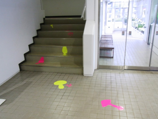 床や階段のきのこ誘導マークは、スタッフが手分けして貼りつけたものです。特殊なシートをはがしてきれいに貼るのはなかなかむずかしく、苦労しながら仕上げました。