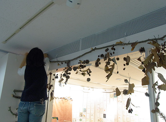 2階はアートコーナーです。会場を木の実や葉っぱで装飾し、アンケートボックスも秋らしくデコレート。今年で8回目になる「きのコン」作品や、6人の作家によるアート作品を展示します。どうぞお楽しみに。