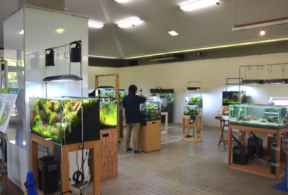 人気のワークショップ「自分だけのアクアリウムをつくろう」は、感染対策をして皆さんの参加をお待ちしています。「みんなで植える水槽」では、大型の水槽(右)が水草植えられ待ちとなっています。