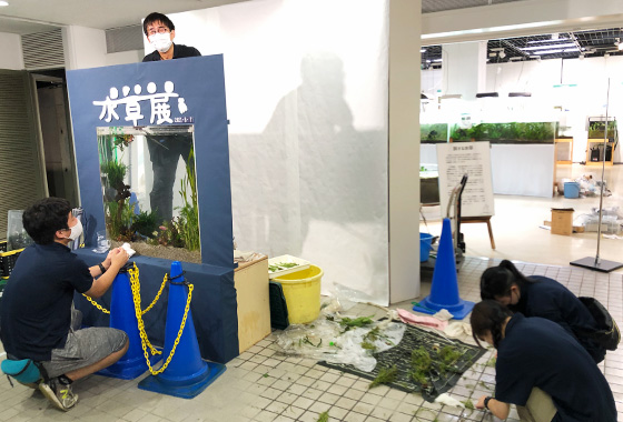 研修展示館では、「旅する水草」をテーマに、さまざまな水草を展示しています。入り口には記念撮影用のウェルカム水槽。水槽の中にいるような写真が撮れます。(早坂誠さんとTCAの学生さんがサポートしてくれています。)
