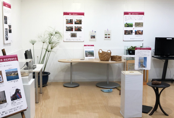 水草と文化のコーナー。今回は編む・漉く・織るとして、繊維としての利用を取り上げます。金色に輝くホシクサの茎という、ちょっと不思議な工芸品も展示しています。