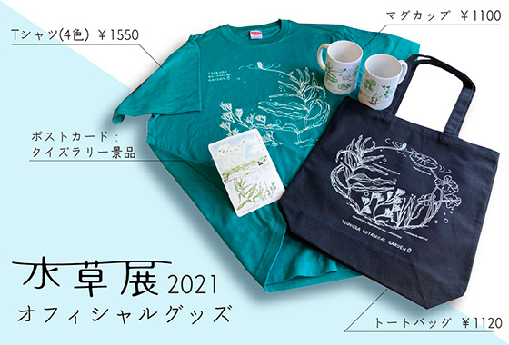 デザインはいずれも、水草展2021のテーマである「旅する水草」に焦点を当てています。グッズに登場する水草は、水草展の展示の中で見ることができますよ。