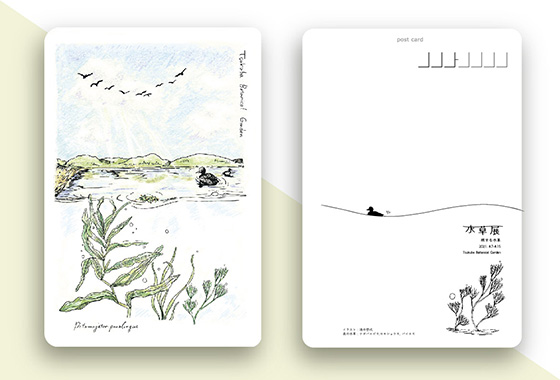 また、水草展クイズラリーに参加すると、景品として「旅する水草」ポストカードをゲットすることができます。ポストカードのデザインはこちら。