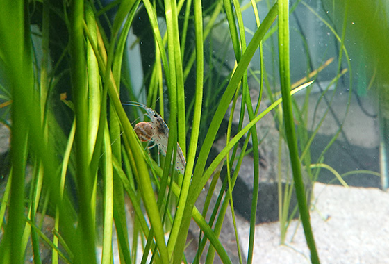 エビは、藻類を食べてくれるので水槽を綺麗に維持するために役立ってくれます。水草展の展示水槽でも、1cmほどのミナミヌマエビが動き回っているのを見かけると思います。そのせかせかとした動きや、コケを持って食べる姿が可愛らしく癒されます。