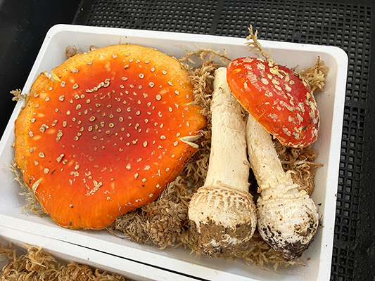 生きのこはただ単に置きっぱなしにしているわけではありません。干からびたきのこ、腐ってしまったきのこは毎日取り除き、新鮮なものに入れ替えています。毎日三分の一くらいの量を入れ替え続けているのです。今年は北海道や富山県などから、つくばの平野部ではまず見ることのできない「ベニテングタケ」を多数送っていただきました。