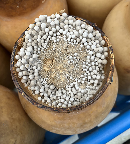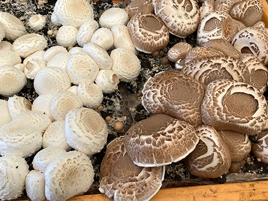 ぎゅうぎゅうになった様子はまさに壮観。ただこのまま放置しておくとカビが生えやすくなってしまうので、時々きのこ展のスタッフが間引きしています。間引いた個体はどうするかというと…捨ててしまう場合もあれば、「少しだけ」味見のために料理することもあります。