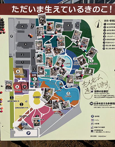 植物園内のきのこは、種数は多いのですが、今年は発生量がイマイチ。でも最後の週末を前にして、ようやく多くのきのこが顔を出しつつあります。園内のきのこを探索したい方はぜひ、森の中に行く前に、中央広場の脇にある「ただいま生えているきのこ」のマップをご覧ください。