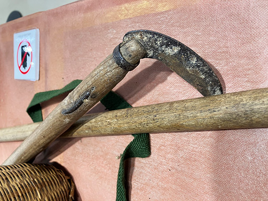 展示室内にある、池田先生が生前愛用していたきのこ採り用の鎌ですが、これにちなんだ恐ろしいエピソードについては、ぜひ会場でご確認ください。