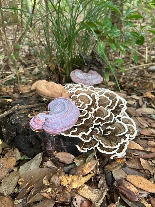 カワラタケといっしょに生えるマンネンタケ(霊芝)。