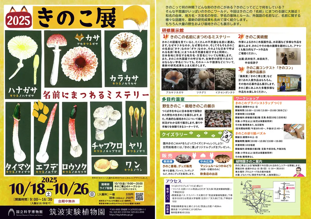 筑波実験植物園で開催される「きのこ展」をより楽しむために、きのこに関する豆知識やクイズであなたのきのこ欲を満たしてみませんか?きのこの名前にまつわる様々な話題を提供します。