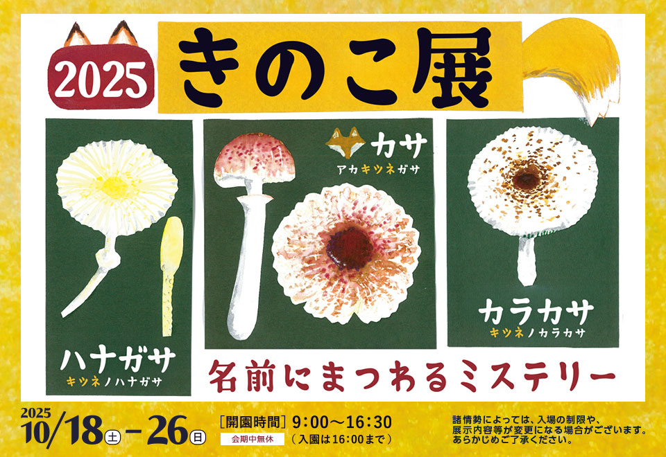 きのこって何の仲間?どんな形のきのこがある?きのこってどこで何をしている?そんな不思議がいっぱいのきのこワールド。今回はきのこの「名前」にまつわる謎に大接近!和名の由来、地方名・方言名の存在、学名の意味とルール、外国語の名前など、名前に関する様々な話題を、最新の研究成果も含めて深く紹介します。もちろん大量の野生および栽培きのこも展示します。