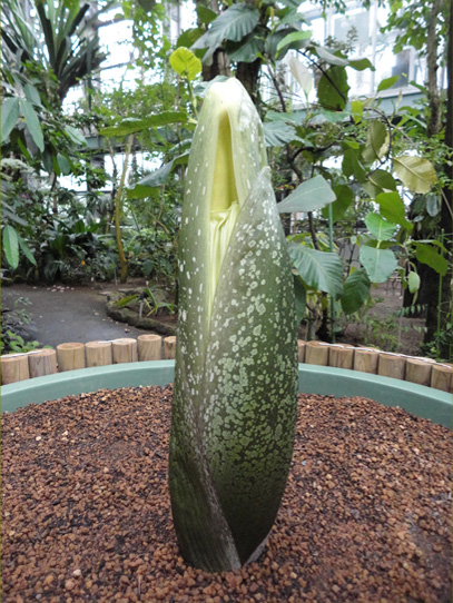 インドネシア・スマトラ島の限られた場所に生える、サトイモ科の絶滅危惧植物。世界最大級といわれる「花」(1つの花のように見えますが、小さな花が集まった花序です。このように、花序全体がまとまって1つの花のように見えるものは「偽花」と呼ばれます)は、高さ3m直径1m以上にもなります。また腐った肉のような強烈な臭いを放ち、世界でもっとも醜い花とも呼ばれます。ギネスブックで認定された世界最大の記録は高さ3.1mで、今回どこまで大きくなるかが注目されます。