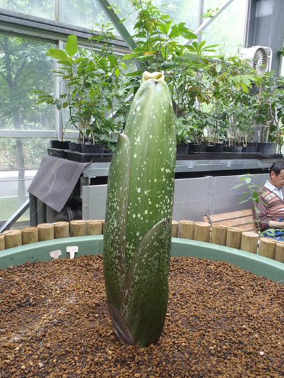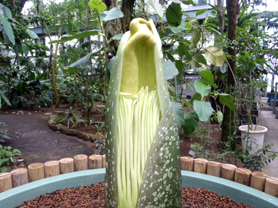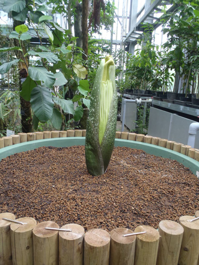 インドネシア・スマトラ島の限られた場所に生える、サトイモ科の絶滅危惧植物。世界最大級といわれる「花」(1つの花のように見えますが、小さな花が集まった花序です。このように、花序全体がまとまって1つの花のように見えるものは「偽花」と呼ばれます)は、高さ3m直径1m以上にもなります。また腐った肉のような強烈な臭いを放ち、世界でもっとも醜い花とも呼ばれます。ギネスブックで認定された世界最大の記録は高さ3.1mで、今回どこまで大きくなるかが注目されます。