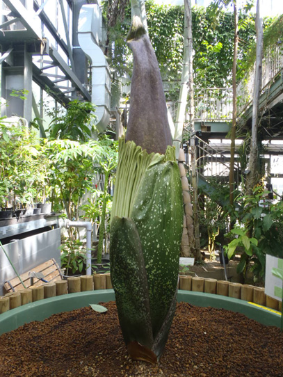 インドネシア・スマトラ島の限られた場所に生える、サトイモ科の絶滅危惧植物。世界最大級といわれる「花」(1つの花のように見えますが、小さな花が集まった花序です。このように、花序全体がまとまって1つの花のように見えるものは「偽花」と呼ばれます)は、高さ3m直径1m以上にもなります。また腐った肉のような強烈な臭いを放ち、世界でもっとも醜い花とも呼ばれます。ギネスブックで認定された世界最大の記録は高さ3.1mで、今回どこまで大きくなるかが注目されます。