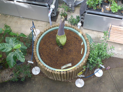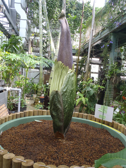 インドネシア・スマトラ島の限られた場所に生える、サトイモ科の絶滅危惧植物。世界最大級といわれる「花」(1つの花のように見えますが、小さな花が集まった花序です。このように、花序全体がまとまって1つの花のように見えるものは「偽花」と呼ばれます)は、高さ3m直径1m以上にもなります。また腐った肉のような強烈な臭いを放ち、世界でもっとも醜い花とも呼ばれます。ギネスブックで認定された世界最大の記録は高さ3.1mで、今回どこまで大きくなるかが注目されます。