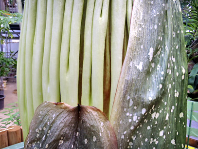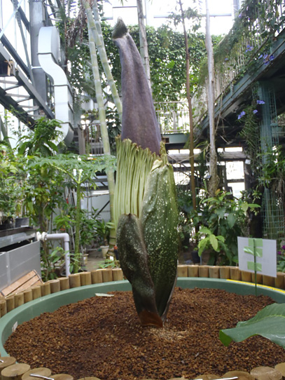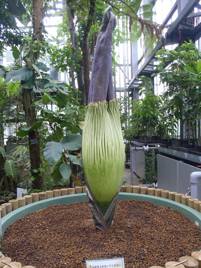 インドネシア・スマトラ島の限られた場所に生える、サトイモ科の絶滅危惧植物。世界最大級といわれる「花」(1つの花のように見えますが、小さな花が集まった花序です。このように、花序全体がまとまって1つの花のように見えるものは「偽花」と呼ばれます)は、高さ3m直径1m以上にもなります。また腐った肉のような強烈な臭いを放ち、世界でもっとも醜い花とも呼ばれます。ギネスブックで認定された世界最大の記録は高さ3.1mで、今回どこまで大きくなるかが注目されます。
