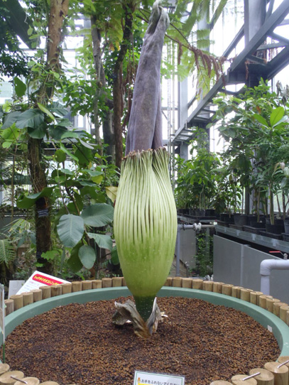 インドネシア・スマトラ島の限られた場所に生える、サトイモ科の絶滅危惧植物。世界最大級といわれる「花」(1つの花のように見えますが、小さな花が集まった花序です。このように、花序全体がまとまって1つの花のように見えるものは「偽花」と呼ばれます)は、高さ3m直径1m以上にもなります。また腐った肉のような強烈な臭いを放ち、世界でもっとも醜い花とも呼ばれます。ギネスブックで認定された世界最大の記録は高さ3.1mで、今回どこまで大きくなるかが注目されます。