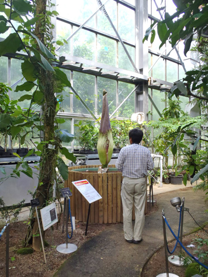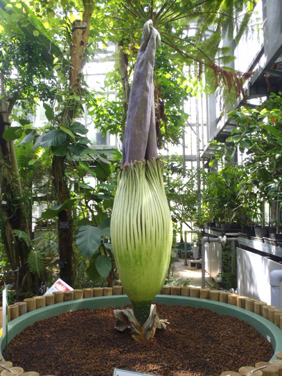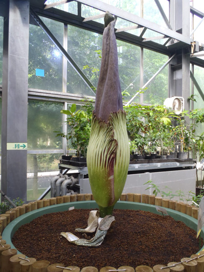 インドネシア・スマトラ島の限られた場所に生える、サトイモ科の絶滅危惧植物。世界最大級といわれる「花」(1つの花のように見えますが、小さな花が集まった花序です。このように、花序全体がまとまって1つの花のように見えるものは「偽花」と呼ばれます)は、高さ3m直径1m以上にもなります。また腐った肉のような強烈な臭いを放ち、世界でもっとも醜い花とも呼ばれます。ギネスブックで認定された世界最大の記録は高さ3.1mで、今回どこまで大きくなるかが注目されます。