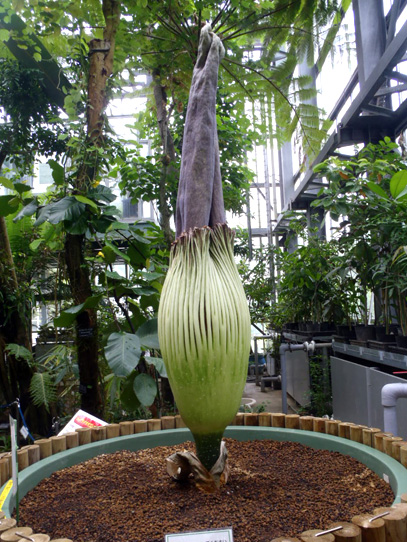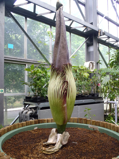 インドネシア・スマトラ島の限られた場所に生える、サトイモ科の絶滅危惧植物。世界最大級といわれる「花」(1つの花のように見えますが、小さな花が集まった花序です。このように、花序全体がまとまって1つの花のように見えるものは「偽花」と呼ばれます)は、高さ3m直径1m以上にもなります。また腐った肉のような強烈な臭いを放ち、世界でもっとも醜い花とも呼ばれます。ギネスブックで認定された世界最大の記録は高さ3.1mで、今回どこまで大きくなるかが注目されます。