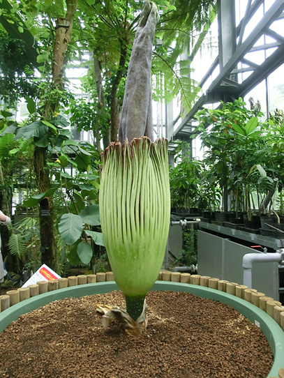 インドネシア・スマトラ島の限られた場所に生える、サトイモ科の絶滅危惧植物。世界最大級といわれる「花」(1つの花のように見えますが、小さな花が集まった花序です。このように、花序全体がまとまって1つの花のように見えるものは「偽花」と呼ばれます)は、高さ3m直径1m以上にもなります。また腐った肉のような強烈な臭いを放ち、世界でもっとも醜い花とも呼ばれます。ギネスブックで認定された世界最大の記録は高さ3.1mで、今回どこまで大きくなるかが注目されます。