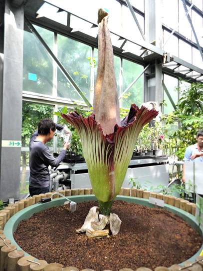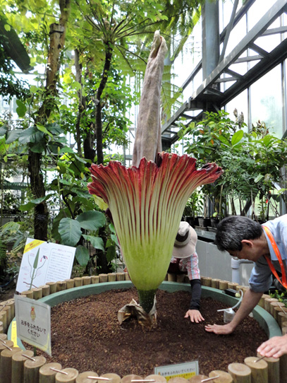 インドネシア・スマトラ島の限られた場所に生える、サトイモ科の絶滅危惧植物。世界最大級といわれる「花」(1つの花のように見えますが、小さな花が集まった花序です。このように、花序全体がまとまって1つの花のように見えるものは「偽花」と呼ばれます)は、高さ3m直径1m以上にもなります。また腐った肉のような強烈な臭いを放ち、世界でもっとも醜い花とも呼ばれます。ギネスブックで認定された世界最大の記録は高さ3.1mで、今回どこまで大きくなるかが注目されます。