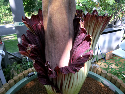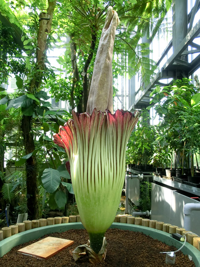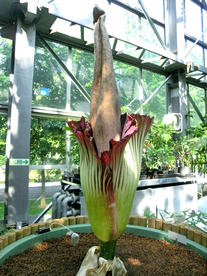 インドネシア・スマトラ島の限られた場所に生える、サトイモ科の絶滅危惧植物。世界最大級といわれる「花」(1つの花のように見えますが、小さな花が集まった花序です。このように、花序全体がまとまって1つの花のように見えるものは「偽花」と呼ばれます)は、高さ3m直径1m以上にもなります。また腐った肉のような強烈な臭いを放ち、世界でもっとも醜い花とも呼ばれます。ギネスブックで認定された世界最大の記録は高さ3.1mで、今回どこまで大きくなるかが注目されます。