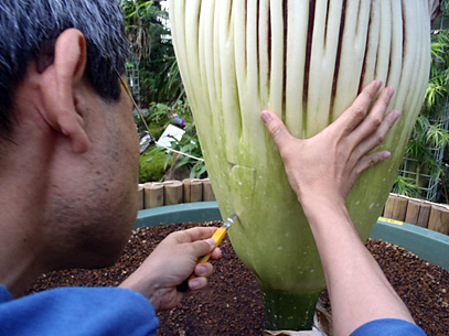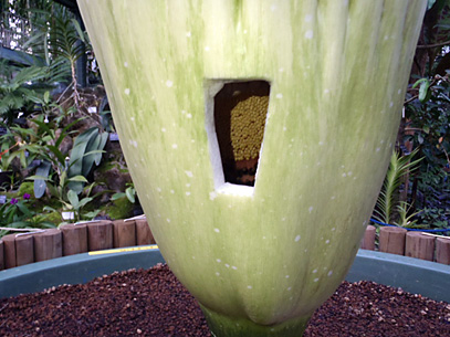 インドネシア・スマトラ島の限られた場所に生える、サトイモ科の絶滅危惧植物。世界最大級といわれる「花」(1つの花のように見えますが、小さな花が集まった花序です。このように、花序全体がまとまって1つの花のように見えるものは「偽花」と呼ばれます)は、高さ3m直径1m以上にもなります。また腐った肉のような強烈な臭いを放ち、世界でもっとも醜い花とも呼ばれます。ギネスブックで認定された世界最大の記録は高さ3.1mで、今回どこまで大きくなるかが注目されます。