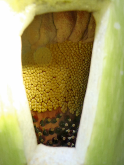 上部の盛り上がっている黄色い部分は長い付属体の根本の部分,その下の黄色い小さい粒々は雄花,一番下の赤い粒々は雌花です。