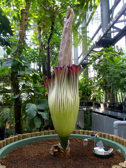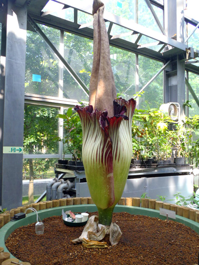 インドネシア・スマトラ島の限られた場所に生える、サトイモ科の絶滅危惧植物。世界最大級といわれる「花」(1つの花のように見えますが、小さな花が集まった花序です。このように、花序全体がまとまって1つの花のように見えるものは「偽花」と呼ばれます)は、高さ3m直径1m以上にもなります。また腐った肉のような強烈な臭いを放ち、世界でもっとも醜い花とも呼ばれます。ギネスブックで認定された世界最大の記録は高さ3.1mで、今回どこまで大きくなるかが注目されます。