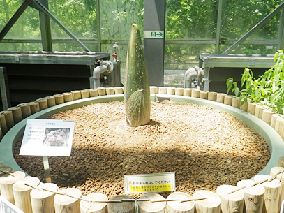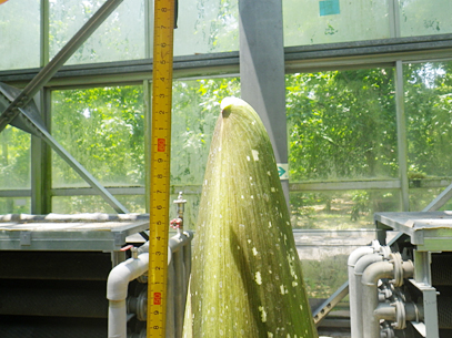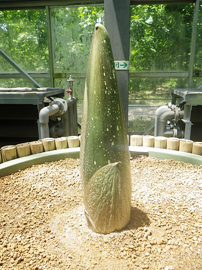 インドネシア・スマトラ島の限られた場所に生える、サトイモ科の絶滅危惧植物。世界最大級といわれる「花」(1つの花のように見えますが、小さな花が集まった花序です。このように、花序全体がまとまって1つの花のように見えるものは「偽花」と呼ばれます)は、高さ3m直径1m以上にもなります。また腐った肉のような強烈な臭いを放ち、世界でもっとも醜い花とも呼ばれます。ギネスブックで認定された世界最大の記録は高さ3.1mで、今回どこまで大きくなるかが注目されます。