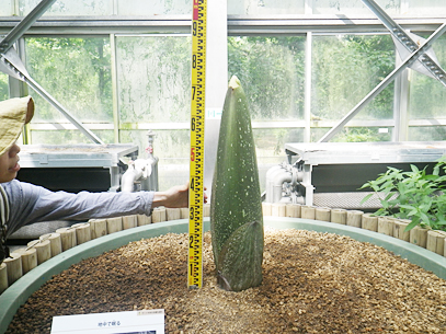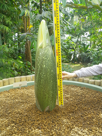 インドネシア・スマトラ島の限られた場所に生える、サトイモ科の絶滅危惧植物。世界最大級といわれる「花」(1つの花のように見えますが、小さな花が集まった花序です。このように、花序全体がまとまって1つの花のように見えるものは「偽花」と呼ばれます)は、高さ3m直径1m以上にもなります。また腐った肉のような強烈な臭いを放ち、世界でもっとも醜い花とも呼ばれます。ギネスブックで認定された世界最大の記録は高さ3.1mで、今回どこまで大きくなるかが注目されます。