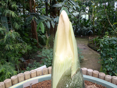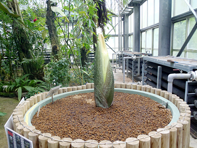 インドネシア・スマトラ島の限られた場所に生える、サトイモ科の絶滅危惧植物。世界最大級といわれる「花」(1つの花のように見えますが、小さな花が集まった花序です。このように、花序全体がまとまって1つの花のように見えるものは「偽花」と呼ばれます)は、高さ3m直径1m以上にもなります。また腐った肉のような強烈な臭いを放ち、世界でもっとも醜い花とも呼ばれます。ギネスブックで認定された世界最大の記録は高さ3.1mで、今回どこまで大きくなるかが注目されます。